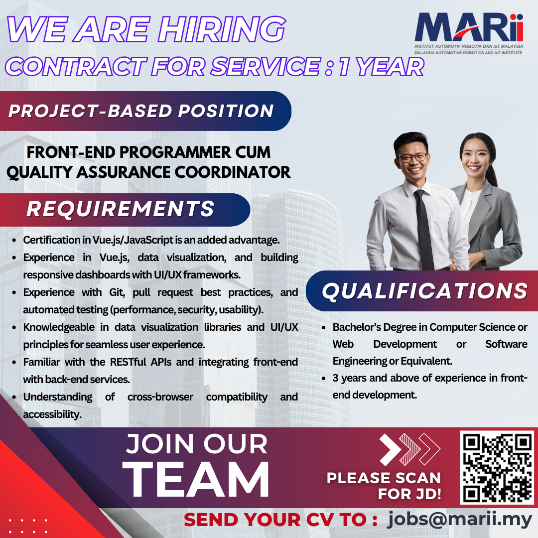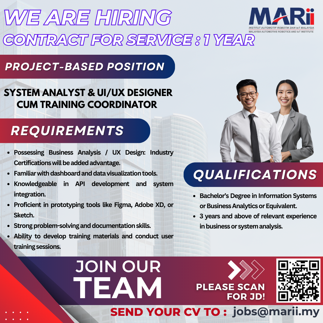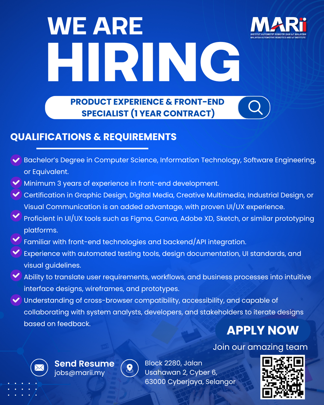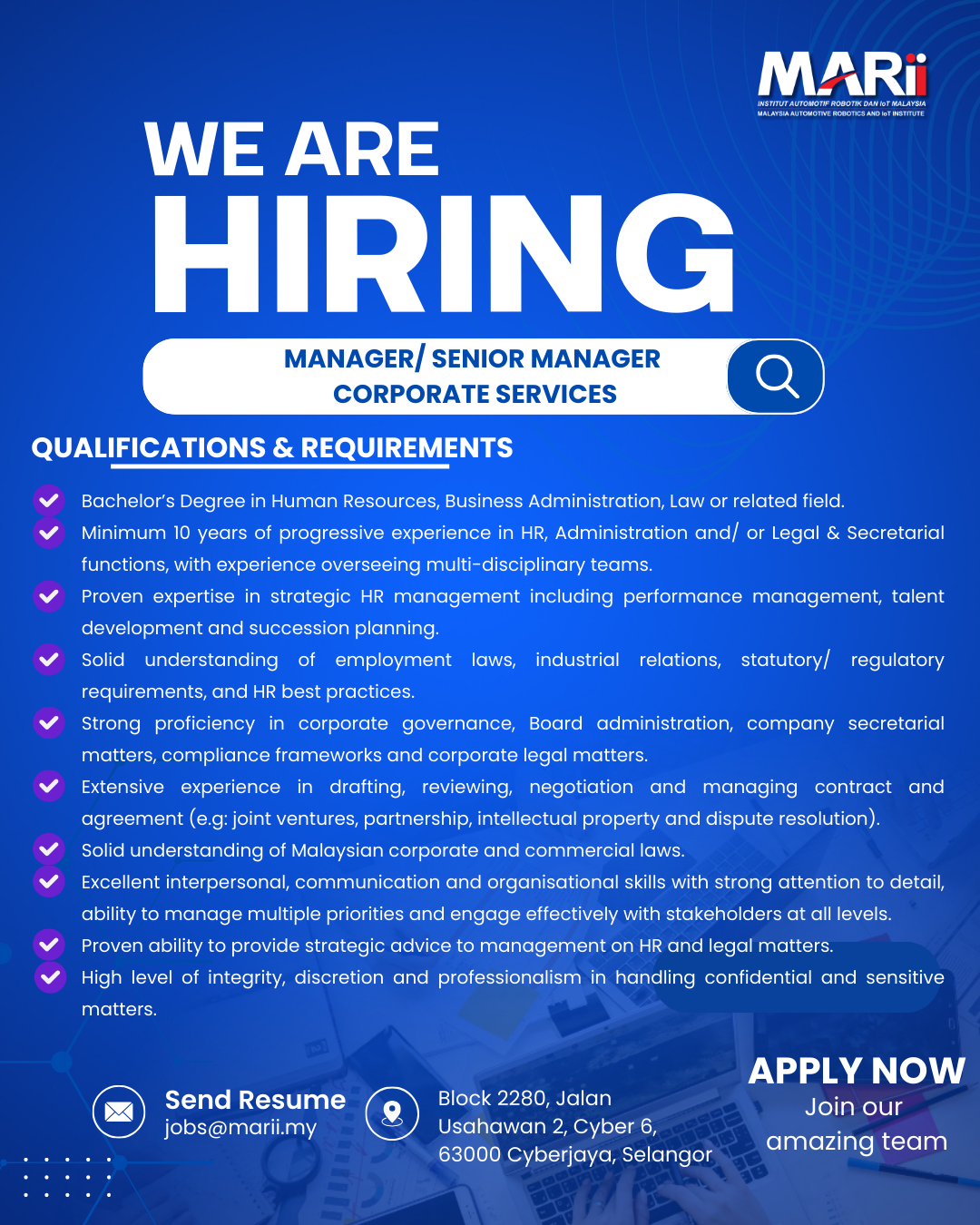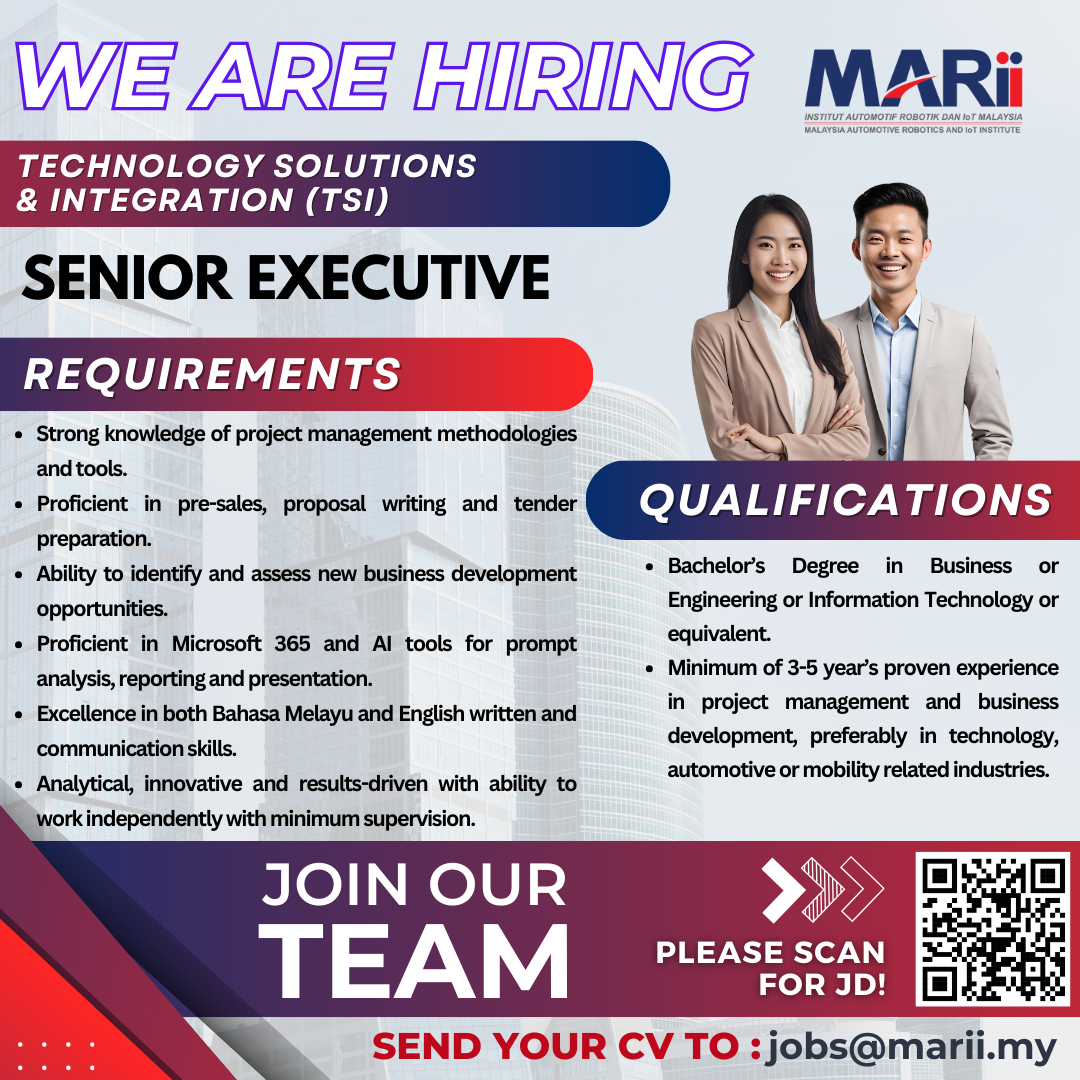 Submit your updated CV to jobs@marii.my for immediate consideration and be a part of our ongoing success!